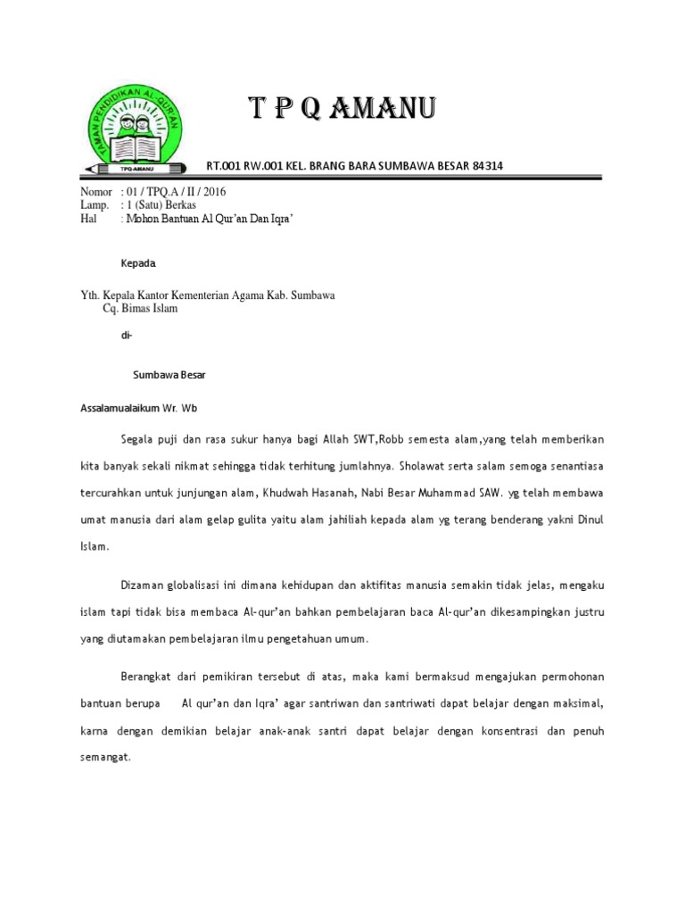 Berikut adalah contoh permohonan dana bantuan operasional tpq (taman pendidikan al qur'an) kepada bapak kepala baznas kabupaten atau kota dalam bentuk file format ms word. Contoh surat permohonan bantuan al quran contoh surat : Check spelling or type a new query. Sangat kami sadari bahwa untuk mewujudkan kegiatan ini tidak mudah tanpa bantuan, sumbangsih dan dukungan pihak lain. Contoh ibadah lisan adalah dzikrullah, membaca al qur'an, mengucapkan kalimat thayyibah, bershalawat kepada nabi shallallahu 'alaihi wa sallam, beramar.
